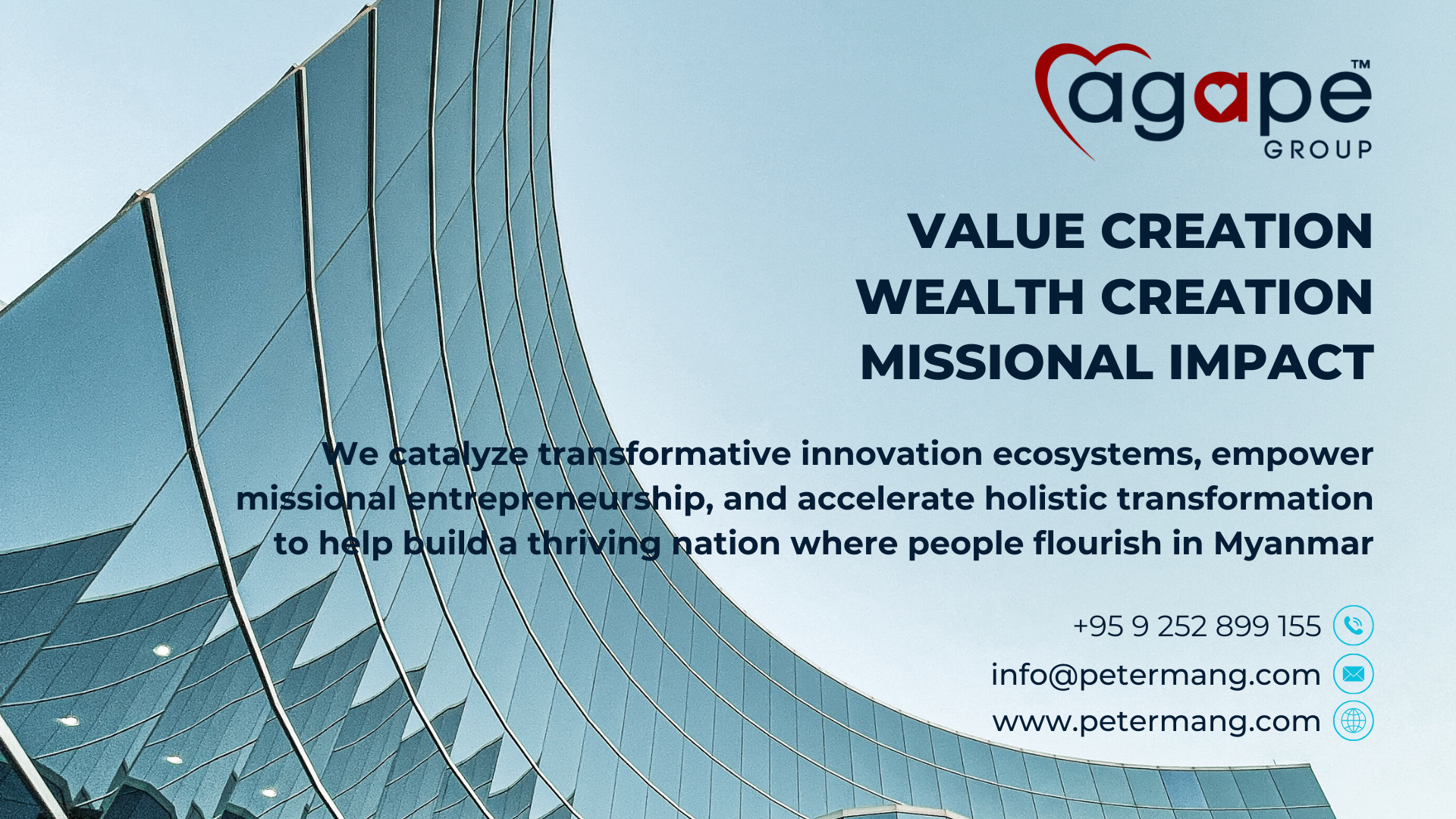 Agape Entrepreneurship is a collaborative network of transformational entrepreneurs and impact investors dedicated to accelerating wealth creation and developing innovative, sustainable solutions that catalyze holistic transformation through entrepreneurship in Myanmar.
