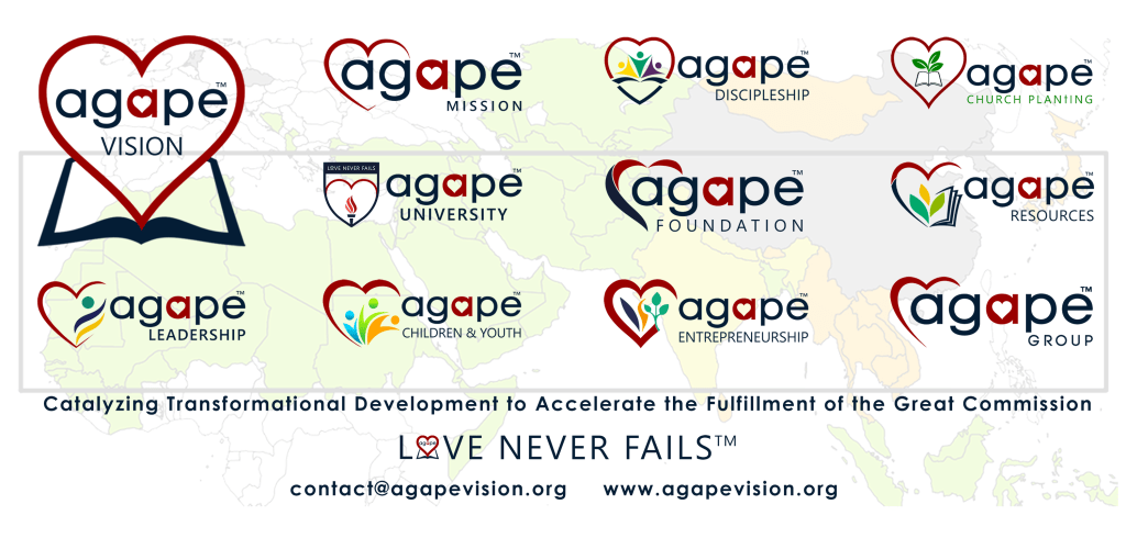 Agape Vision Global has ten strategic initiatives: Agape Mission, Agape Discipleship, Agape Church Planting, Agape University, Agape Foundation, Agape Resources, Agape Children and Youth, Agape Entrepreneurship, Agape Group, and Agape Leadership.
