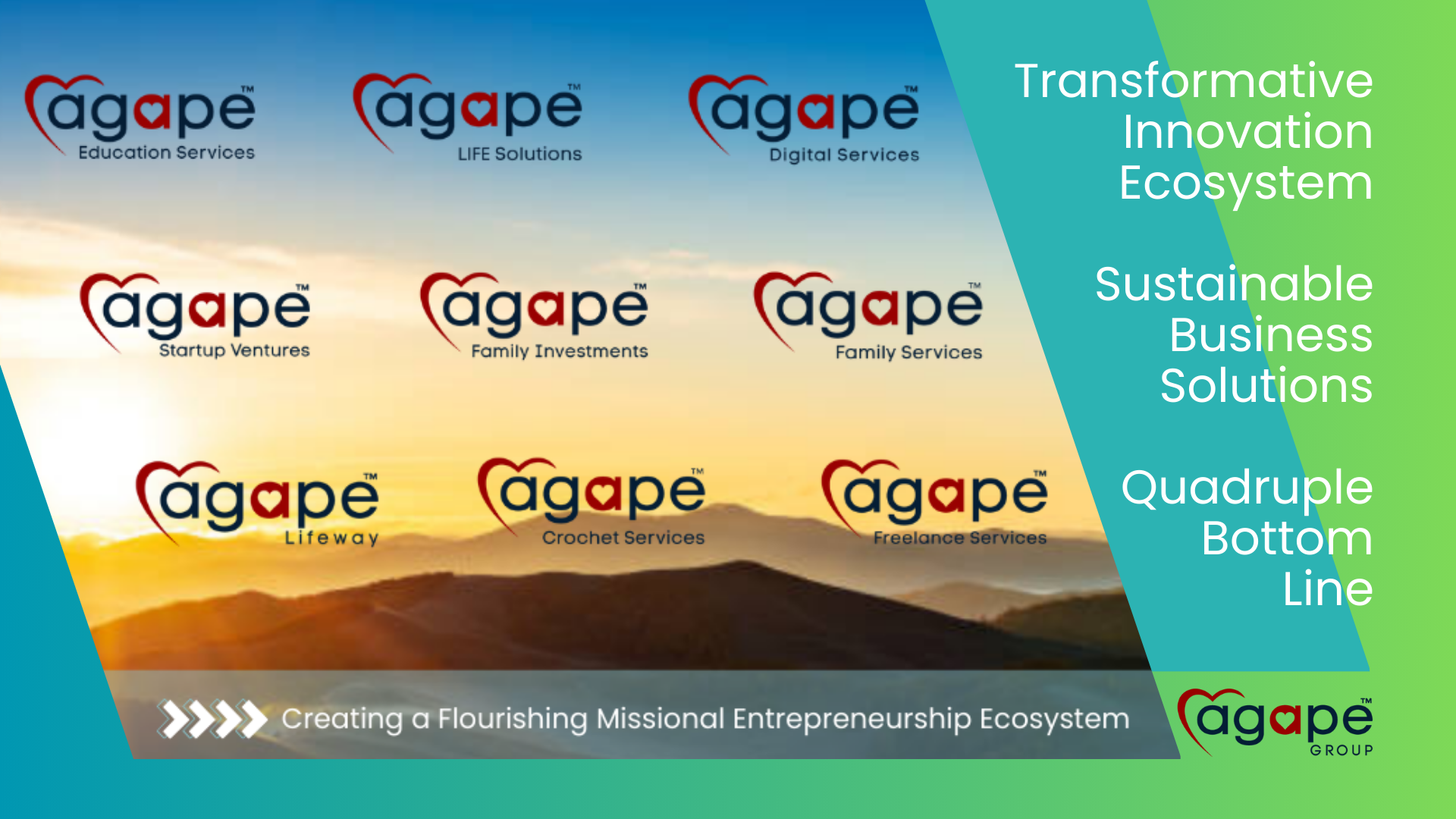 Agape Group is a privately held conglomerate of missional enterprises dedicated to glorifying God by catalyzing transformational development through accelerated value creation, inclusive wealth creation, and holistic missional impact.